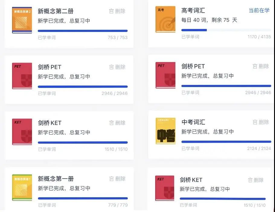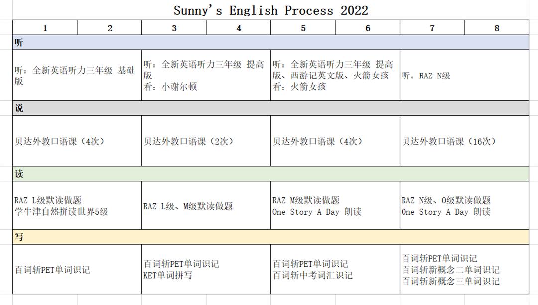 两年多用了两个账户做百词斩单词,分别是KET、PET各刷过两轮,新概念第一册、第二册、中考词汇各一轮,新概念第三册和高考词汇正在进行中。这是娃2022年英语学习进程表