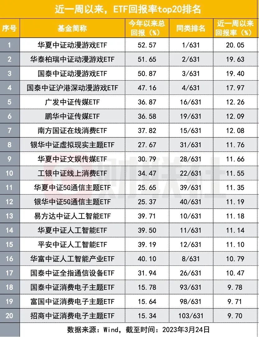 Wind数据显示,截至3月24日,中证动漫游戏指数年内涨幅达到53%,跟踪该指数的华夏、华泰柏瑞、国泰等中证动漫游戏ETF包揽了今年ETF基金回报率的前三名。其中,华夏中证动漫游戏ETF不仅年内涨幅达到52.57%,近一周回报率也超过20%。