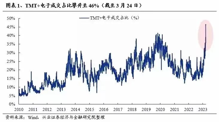 兴证策略团队同时指出,近期“数字经济”的成交占比也在快速提升,3月24日TMT+电子的成交占比已达到46%,由此引发市场对于板块情绪是否已到高点、行情会否终结的担忧。