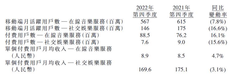 (图源:腾讯音乐财报)这个付费水平和社交娱乐业务几乎无法相提并论。四季度,同比环比双双回落的社交娱乐服务月均ARPPU也能来到169.6元。