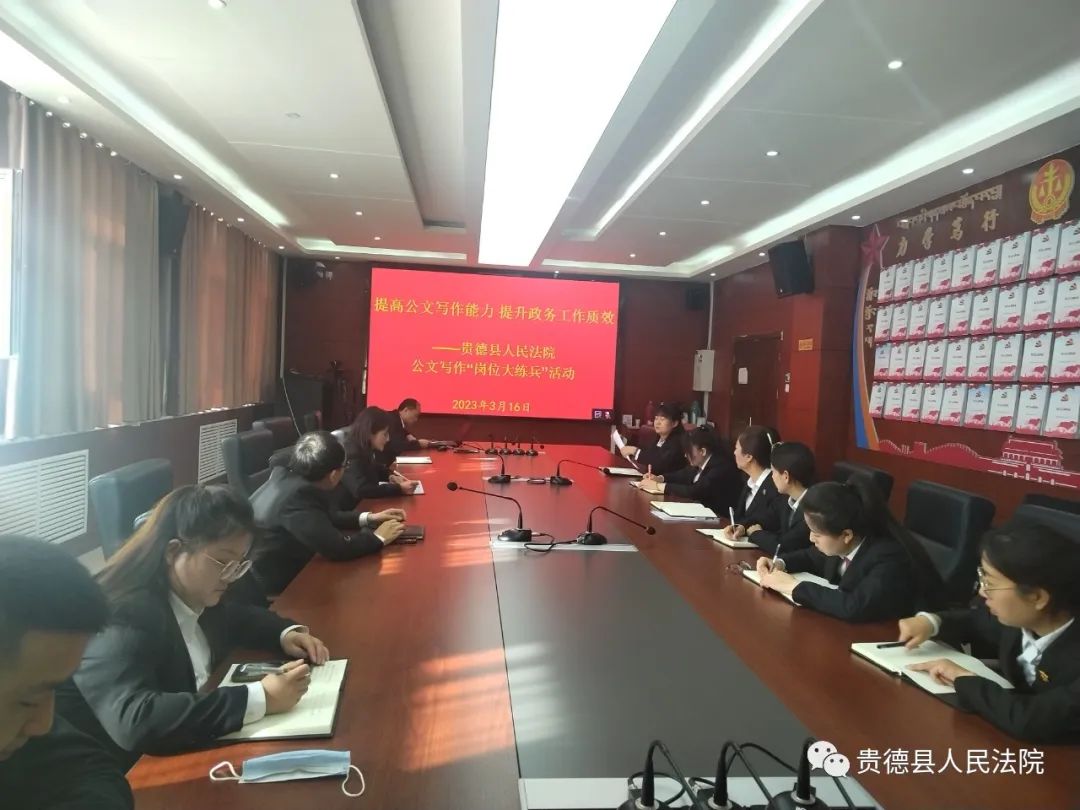 为深入推进全省法院“质效双优”竞赛活动,进一步提高我院行政人员公文写作能力和司法政务工作水平。近期,贵德县人民法院开展了“提高公文写作能力、提升政务工作质效”岗位大练兵活动,院综合办公室、督察室、政治部全体司法行政人员参加了培训。