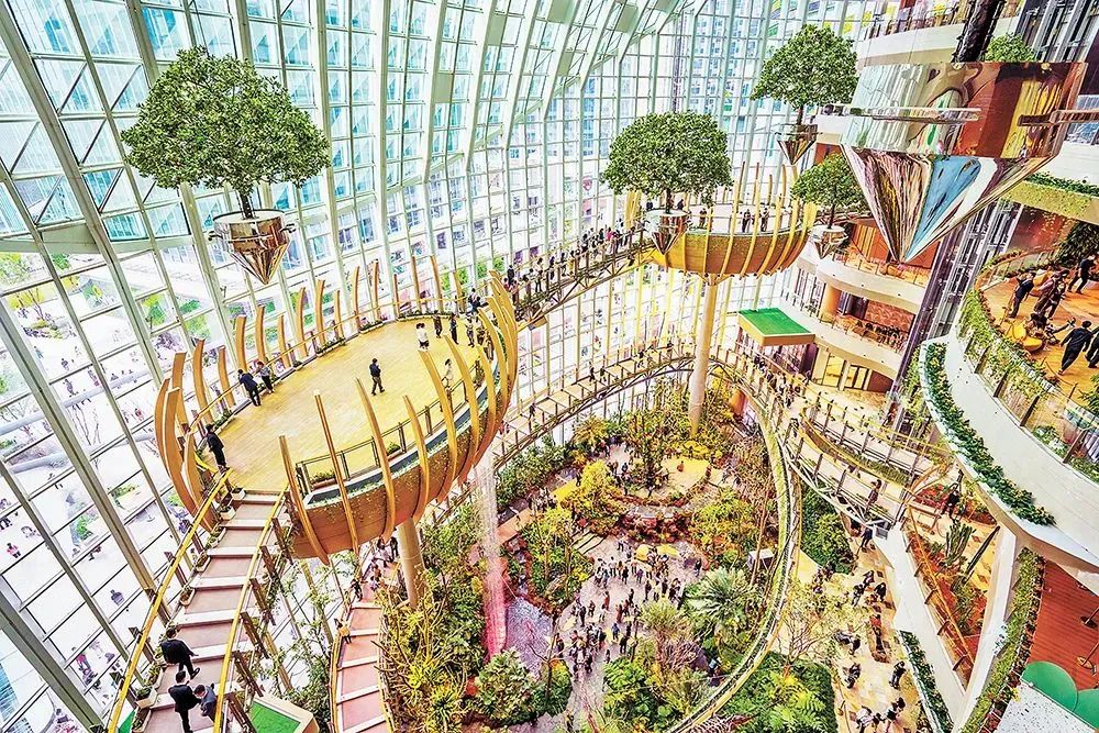 图1 曼谷Mega Food Walk购物中心重庆光环购物公园是国内首个城市自然共同体商业,商场室内有大面积的绿植,跨越七层、高42米的绿色植物景观构建起人与自然、商业与生活的连接。园内有两个突出的景观,一个是沐光森林植物园,一个是天空鸟居与风语鸟道,前来购物的游客如同置身于公园之中。(图2)