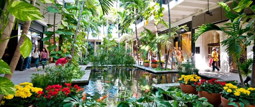 图3 巴尔港热带雨林购物中心美国阿拉莫阿那购物中心将夏威夷风光搬进商业空间,是世界上最大的露天购物中心之一,内设有露天走廊,中央是带百合花的锦鲤池塘,两旁排满了棕榈树和热带植物,购物者和游客可以坐在岩石上放松,是集购物空间、演艺空间、餐饮空间、绿色休闲空间为一体的实体商业空间(见图4)。