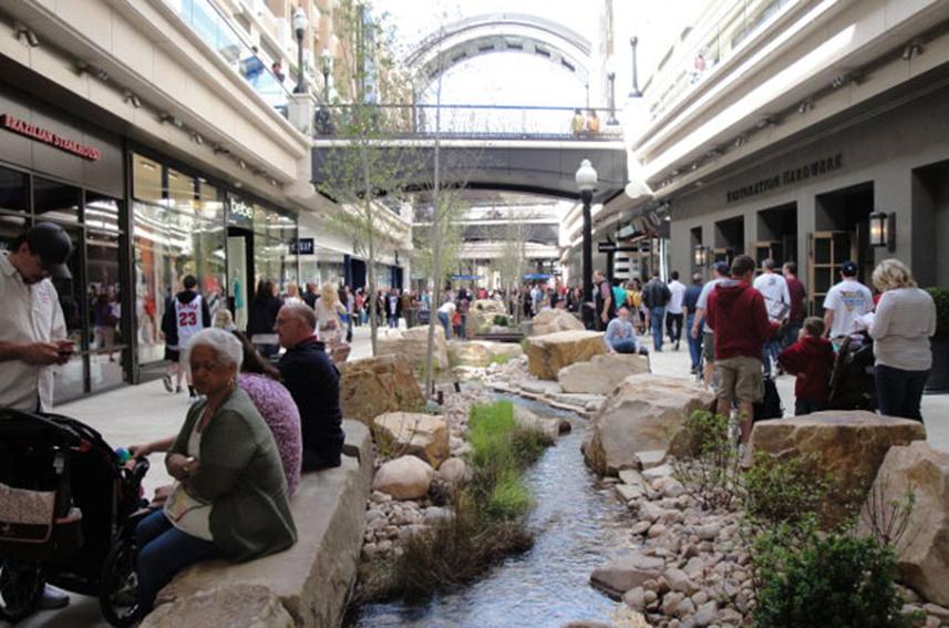图5 难波公园商业空间鸟瞰图美国盐湖城的“城市溪流中心”由废弃商场更新改造而成。该项目以一条一公里长的人造溪流为中脊,将零售店、购物中心、娱乐休闲中心、办公空间、居住空间同各类公共空间连接起来,并建成了美国最大的流动水体即三座瀑布和一座50英尺高的喷泉。沿着 “S”形绿色溪流空间散步,让人回想起1847年盐湖城成立的历史,沿途丰富的商业空间与公共空间让人兴趣盎然,成为市民非常喜爱的消费休闲与开展公共活动的场所(图6)。