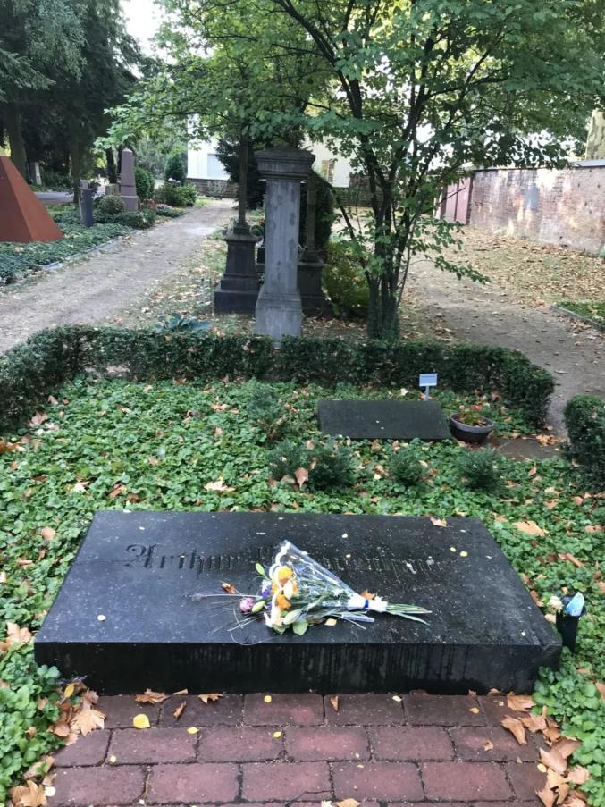 为了出版《附录和补遗》,2018年9月本书责任编辑专程去叔本华生活了28年的法兰克福,做了三件事。第一件事是拜谒叔本华墓,代表译者,代表中国读者献花。黑色的长方形的墓碑横卧在冬青环绕的草坪上,刻着歌德体“Arthur Schopenhauer”。这是叔本华临终前要求的样子,没有头像,没有生卒年。