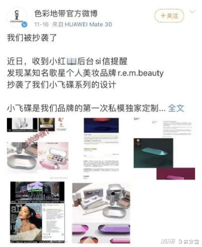 同样在2021年闹得沸沸扬扬的事件,就是美国歌手“A妹”Ariana Grande 的个人品牌r.e.m.beauty,产品外观被指涉嫌抄袭国产品牌色彩地带的原创设计。