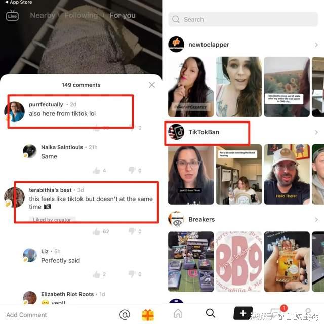 在笔者刷到的近几天的 Clapper 视频中,有不少用户在评论区表示自己是从 TikTok 来的,为的就是防止 TikTok 被封,而在 Clapper 搜索主菜单下,TikTok ban 的话题热度也很高,这都从侧面给了上述猜想一点支持。