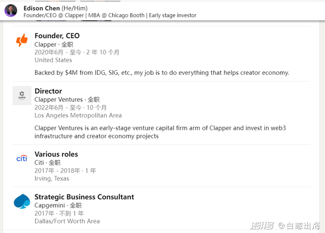 Clapper 的创始人 Edison Chen 是一位华裔,毕业于芝加哥大学,此前曾在花旗银行等企业担任 IT 顾问,但每段职业都时间不长,直到 2020 年成立了 Clapper。