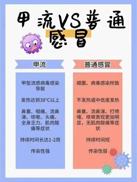 流感与普通感冒不同之处在于普通感冒传染性小,是普通病毒引起的呼吸道疾病,主要由血清型的病毒引起为主,起病急,早期症状有咽干、喷嚏、鼻塞、流涕等,一周内可痊愈,病情较轻;而甲型流感由甲型病毒引起,传染性强,症状为发热、畏寒、全身不适等,发热会持续3-5天,轻者3日内痊愈,重者要两周,甚至一个月。正确预防
