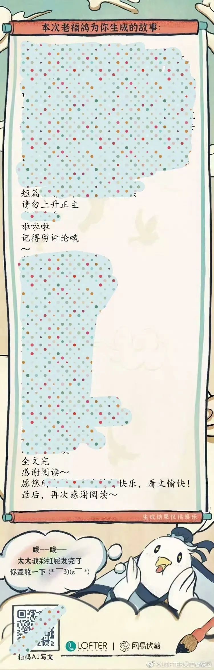 她表示:“LOFTER大概是2020年还是2021年就有AI写作的工具了。虽然不清楚它具体是怎么抓取用户的文章的,但是可以很确定它确实是在融梗。我印象最深的是,有一个AI生成的段子涉及具体的数字,里面的数字和我写的段子的数字一模一样,搞笑的是那个数字其实是一个有特殊意义的代号,AI显然没理解,直接照搬了。”
