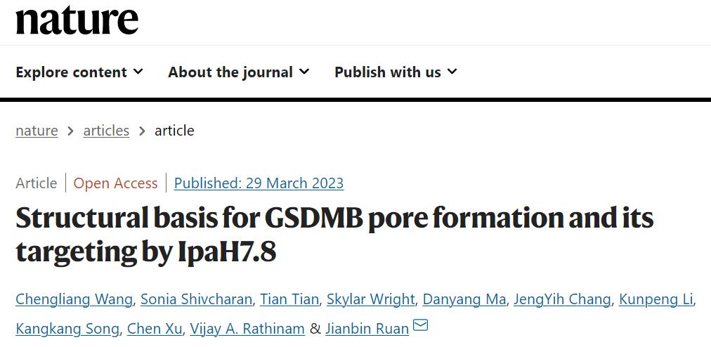 2023年3月29日,美国康涅狄格大学健康中心免疫系阮建彬教授课题组(第一作者为汪成亮博士)在 Nature 期刊发表了题为:Structural basis for GSDMB pore formation and its targeting by IpaH7.8 的研究论文。