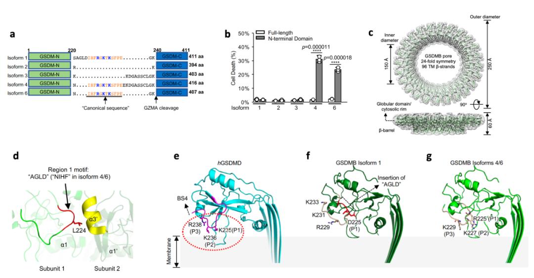 图1:IpaH7.8识别GSDMB结构机理前文提到,人源GSDMB存在至少6种剪接体。其中剪接体5仅包含C端结构域,其他剪接体具有保守的N端和C端结构域,而两个结构域之间的链接区域具有不同的长度和序列(图2a)。推测链接区域可能介导了对GSDMB成孔活性的调控。实验表明,GSDMB剪接体4和6能够明显导致细胞焦亡,而剪接体1、2和3则不具备这种活性(图2b)。