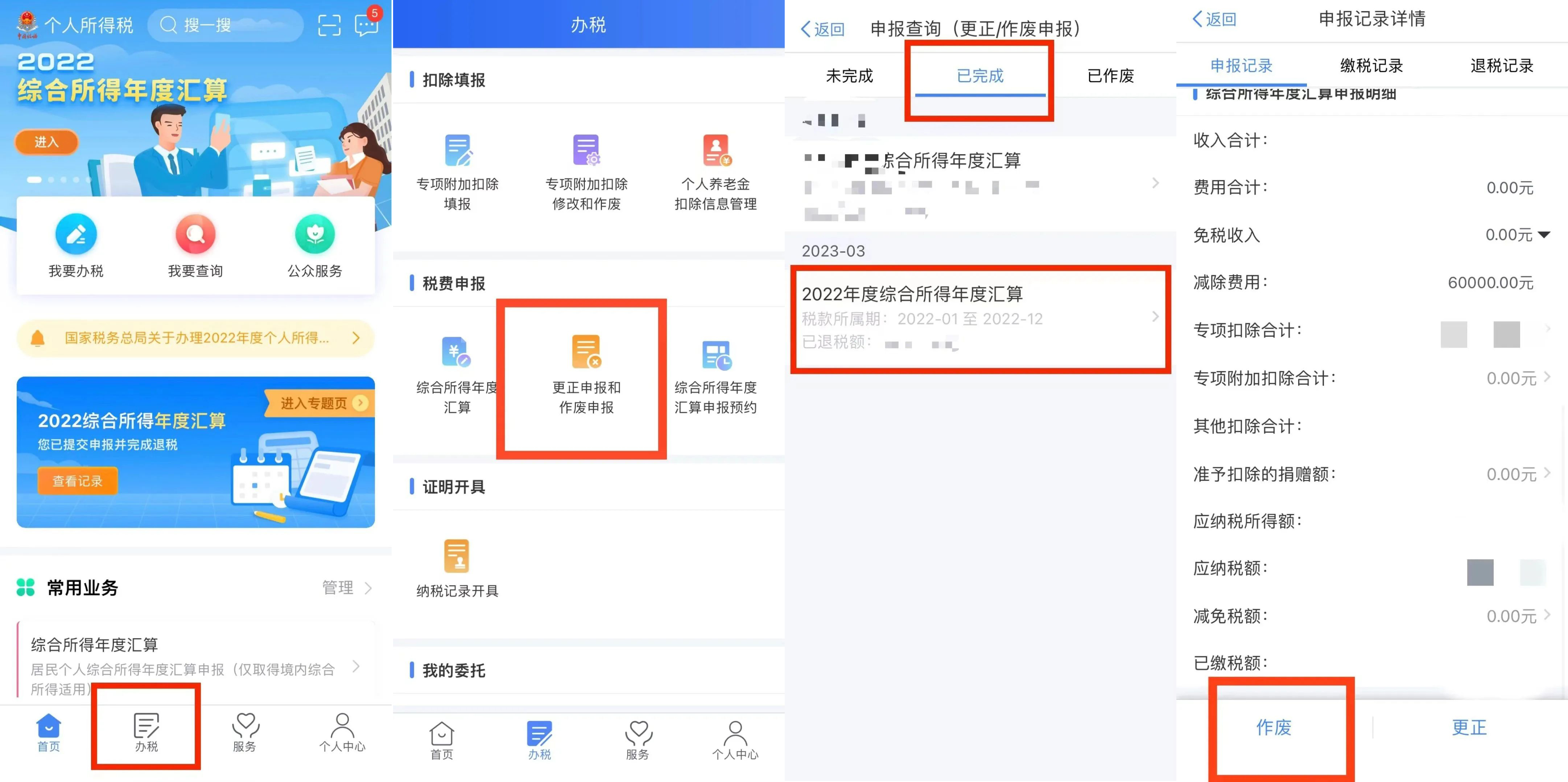 打开个人所得税APP完成登录,点击【办税】——【更正申报和作废申报】——【已完成】——【2022年度综合所得年度汇算】,选择【申报记录】,完成作废。