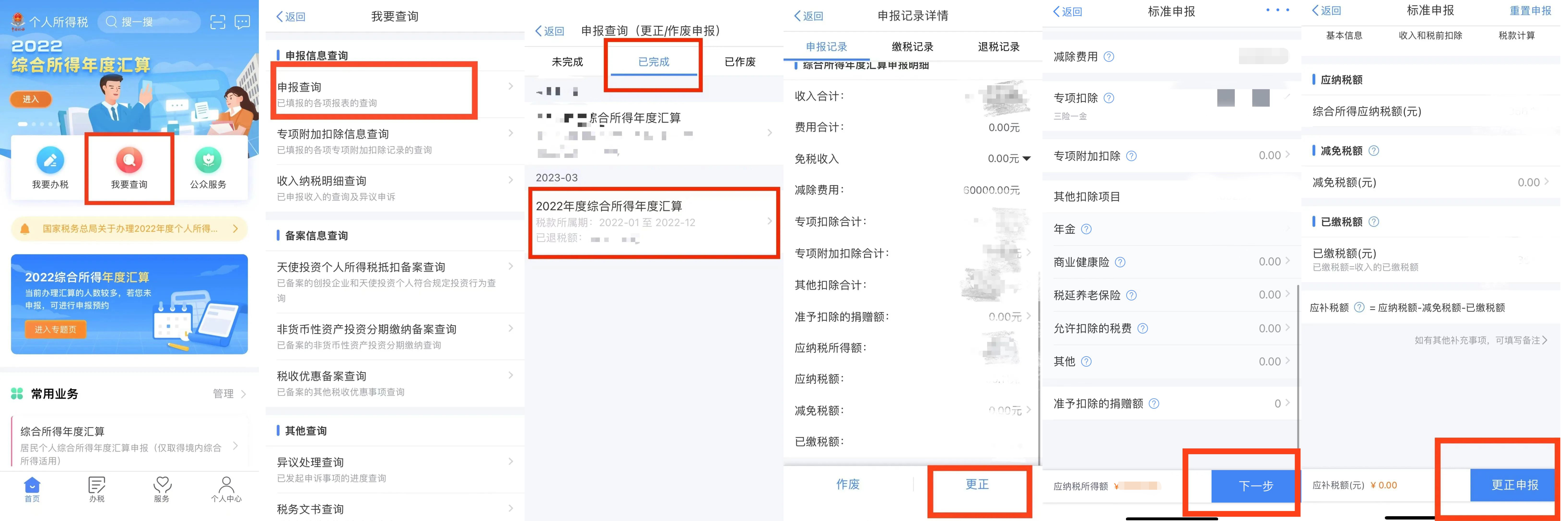 回到首页,点击【我要查询】——【申报查询】——【已完成】——【2022年度综合所得年度汇算】,选择【申报记录】——【更正】,根据您的实际情况更正相应内容,确认后,点击【下一步】——【更正申报】即可。