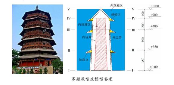 本届赛题以三重木塔结构为基本单元,要求参赛者在限定空间内采用竹材完成空间结构模型设计和制作,针对竖向、扭转及水平等三级荷载工况进行模型受力分析与加载,全方位考察参赛者的专业设计和劳动实践能力,选手必须在内、外边界线的限定区域制作模型,搭建三层塔式结构。赛题首次引入装配式节点,要求制作上下可分离结构,并在加载前通过装配式节点实现组装,以考验参赛者手工制作和处理细节的能力。模型加载点在模型制作完成后随机抽取,荷载工况组合数量巨大,这给模型设计、分析和制作带来巨大挑战,只有通过对各层挑檐及塔顶处分三级荷载工况加载,以及相对的刚度与受力性能后,制作精良、受力清晰、轻质刚强者方能获胜。据悉,赛题的原型为应县木塔,它是我国现存唯一的纯木构楼阁式古塔,建筑宏伟,体量高大,设计精妙,外形稳重庄严,历经近千年的风雨沧桑,仍巍然矗立,堪称天下奇观,是世界木结构建筑之典范,与意大利比萨斜塔、巴黎埃菲尔铁塔并称“世界三大奇塔”。