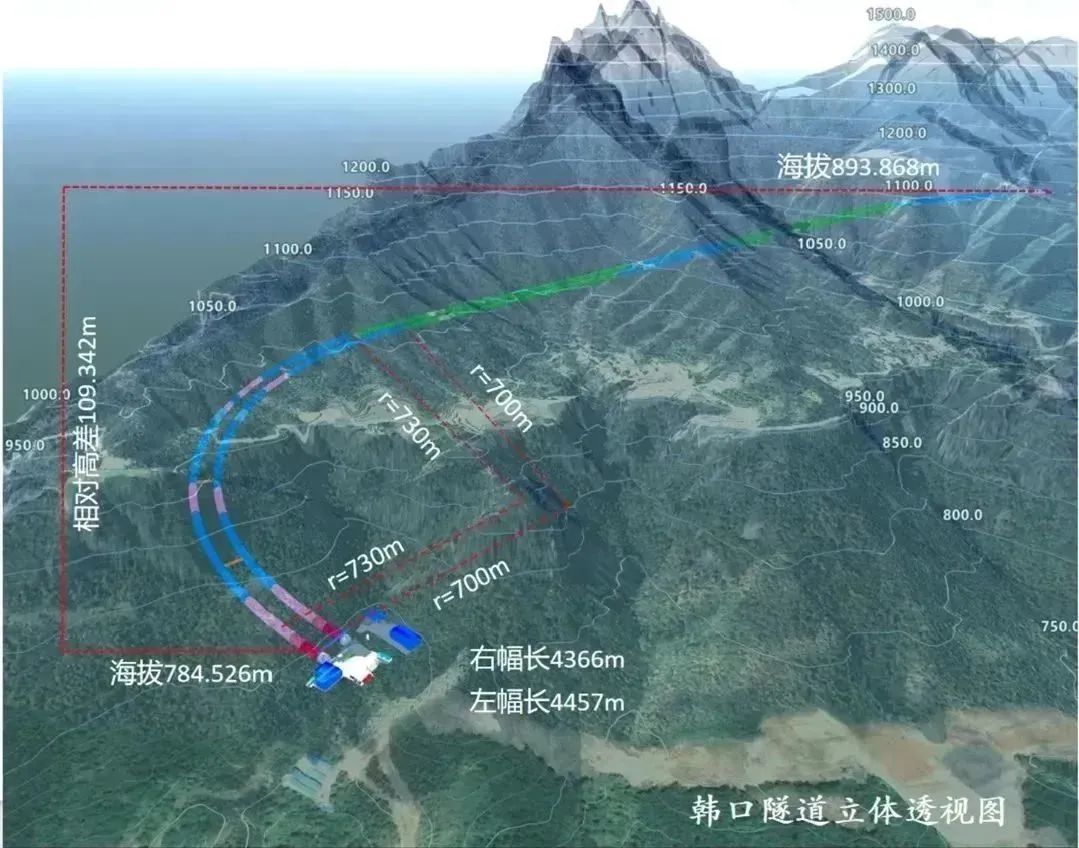 韩口隧道海拔高程在784米至893米之间,进出口最大相对高差109.342米,左线长4457米,右线长4366米,长度超过现有吉尼斯世界纪录保持者——延崇高速金家庄特长螺旋隧道(左线长4128米,右线长4104米)。由于直线坡度过陡,只能建成螺旋形,内部曲线半径最小只有700米,不仅有缺氧的风险,还容易发生偏斜,建设者要在近乎垂直的绝壁上修隧道,运送物资、用水都十分不便。且隧道周边是岩体很薄的层状砂岩,还存在发生塌方和山体滑坡的风险。