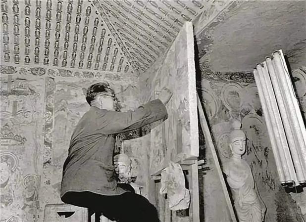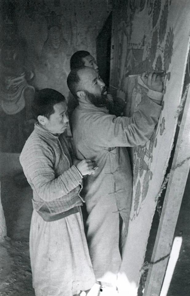 1943年,张大千在敦煌榆林窟第十五窟甬道内临摹1941年春末至1943年的两年零七个月的时间,张大千一行完成了包括莫高窟309个编号、西千佛洞19个编号、榆林窟29个编号、水峡口6个编号在内的大批敦煌石室的测量、考察和记录,不仅是国人中全面系统实地调查、记录敦煌石窟内容的先行者之一,也堪称敦煌艺术学研究的重要奠基人。张大千之子张心智、侄张比德,门人肖建初、刘力上,友人谢稚柳,画家张宗慰,油工窦占彪、李复,喇嘛画师昂吉、格朗、三知、夏吾才朗、杜杰林切等人先后参与到临摹敦煌壁画的工作中。贯穿张大千先生不同时期的艺路历程,临摹敦煌的经历,使大千的艺术创作产生了极大变化,笔下的敦煌,其艺术魅力也影响了包括段文杰、史苇湘、潘累兹、李承仙等在内的众多有志青年的人生道路,引发世人对敦煌瑰宝这一世界文化遗产的热爱与追求,有传承之功。