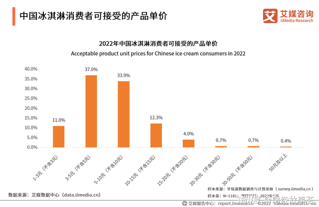 据艾媒咨询数据显示,消费者对雪糕冰淇淋单价的接受度普遍在3~9元之间,占比为70.9%;12.3%的消费者可接受10~15元;单价超过20元的可接受度极低。