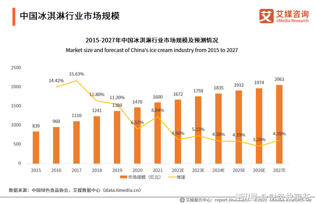 艾媒咨询数据显示,目前中国冰淇淋市场规模已达千亿水平,预计2027年将突破2000亿元,对钟薛高来说,开拓平价雪糕才有可能分走这千亿市场的大块蛋糕。