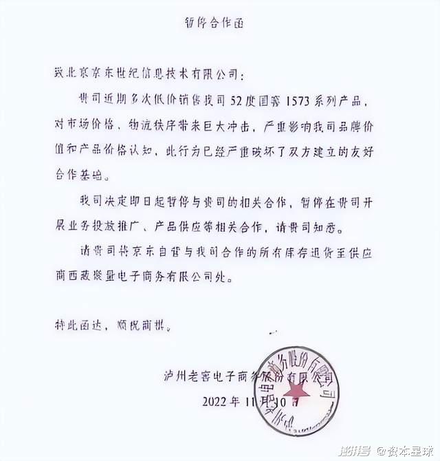 比如去年泸州老窖旗下泸州老窖电子商务有限公司对外发布和京东的暂停合作函,指责京东存在低价倾销的行为。事实上,泸州老窖电子商务有限公司的指责并非空穴来风。泸州老窖旗下大单品52度国窖的市场批发参考价在905元左右,单瓶厂商指导价为1499元。但在去年11月14日,泸州老窖官方京东自营旗舰店该款白酒的预估到手价为1139元/瓶,叠加优惠最低到手价为908元/瓶,这一价格直逼市场批发参考价。显然扰乱了商家自有的定价体系。