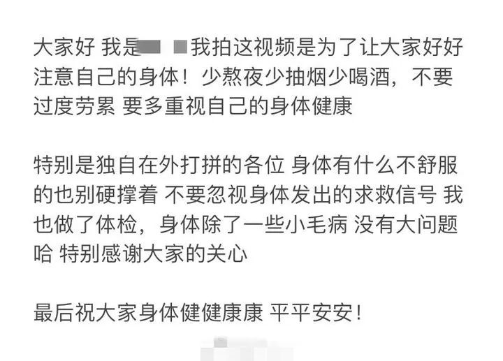 到傍晚4点多,该博主在评论区置顶了留言:身体除了一些小毛病,没有大问题。谢谢大家的关心,我做这期内容的初心只是想让大家多重视自己的身体!