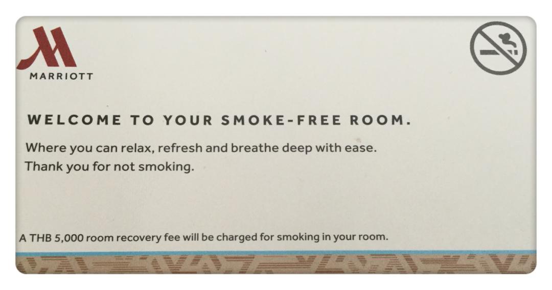 饭店大堂服务员为我办理入住房间后,面带微笑递给我一张精美的英文卡片,“Welcome to your smoke-free room”欢迎您来到无烟客房,您将感到轻松与清新的空气,谢谢您不吸烟。如果在客房内吸烟将被收取5000泰铢用于清洁客房”这让我感到既惊讶又温馨。我微笑的告诉她:“我不会吸烟”,她虔诚地双手合十点头致谢:“谢谢您不吸烟”!我好奇的询问服务员“在普吉岛其他酒店也有同样规定吗?”她肯定地点点头道“Yes!Yes!Coincident!”。