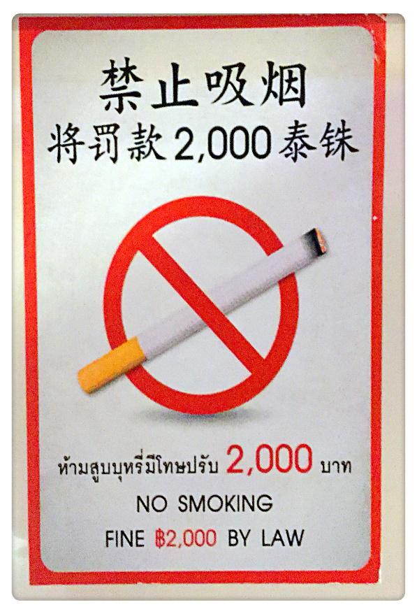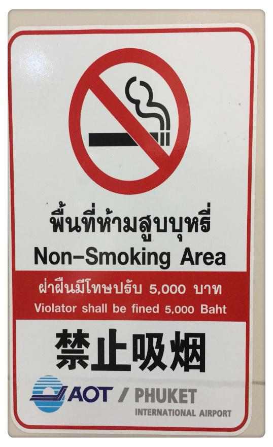 在后续的行程中,我特别注意普吉岛的旅游饭店、餐厅、公交车、出租车、卫生间中禁止吸烟违者罚款的警示标识比比皆是,超市中售卖的盒装烟草全部印制了吸烟导致健康伤害的警示图形!
