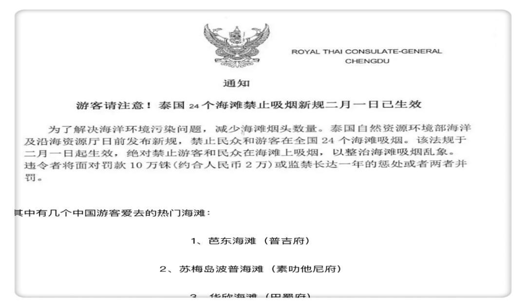在美丽的普吉岛,当然要去最有魅力的海滩。我注意到在通往酒店海滩的道路旁赫然矗立着“海滩禁止吸烟”的警告牌。原来,2018年初泰国官方公告24个海滩(如芭东海滩;苏梅岛海滩等)禁止民众和旅游者吸烟,违者将面临罚款10万泰铢(两万人民币)或长达一年的监禁处罚。至此,我猛然感悟到泰国及普吉岛不愧为世界著名旅游胜地,在履行世界卫生组织《国际烟草控制框架公约》、杜绝“二手烟”危害公众健康、环境保护方面直接与世界文明接轨,控烟措施真是可圈可点,值得赞扬。
