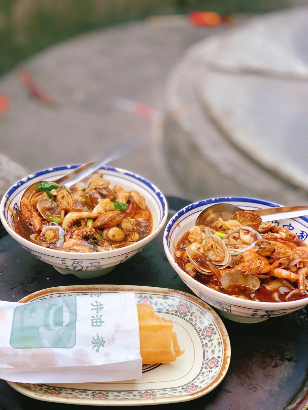 小红书@吃,我是认真的捞粉里的海鲜很多,虾、沙虫、扇贝满满一碗,仿佛要溢出来一般。再配上一份老井油条,吃的饱饱的。