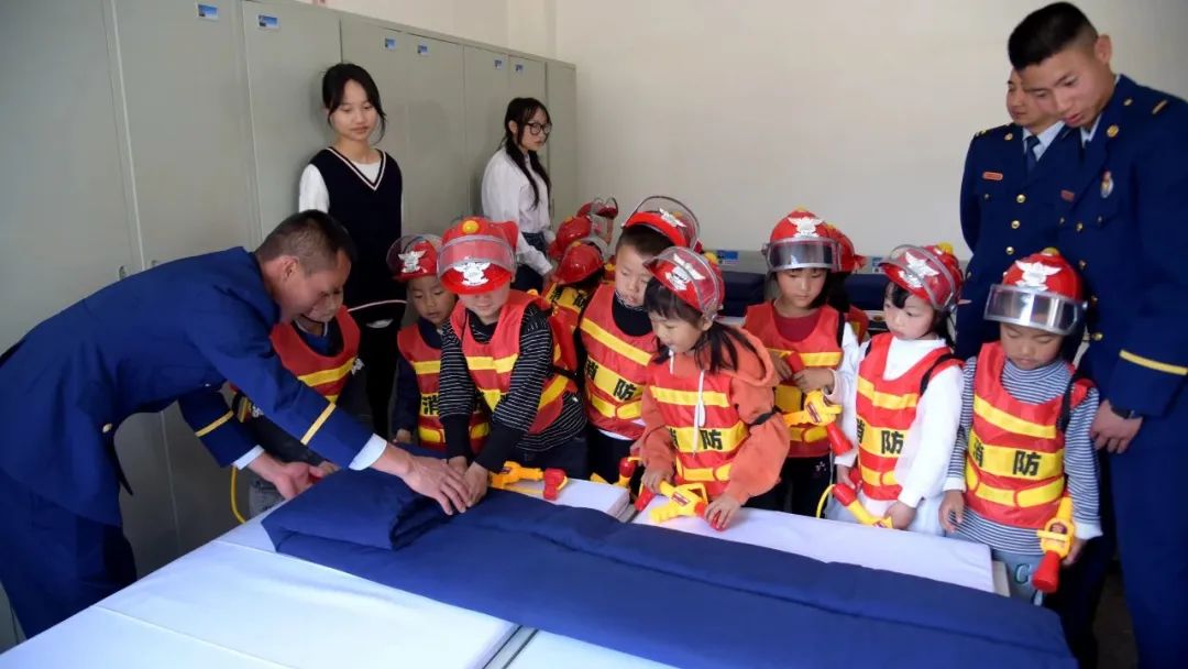 消防员叔叔为孩子们逐一展示并详细介绍了消防员的秘密武器——各种各样的消防装备和救生器材。小朋友们通过直观的画面,了解和学习消防灭火知识。消防员还带领孩子们参观荣誉室、宿舍等,向小朋友们讲解训练和日常工作生活的“每时每刻”,还向师生展示“豆腐块”的被子是如何从一床被子“变身”成方方正正的“豆腐块”。带领小朋友们观看了中队遂行灭火救援任务宣传片,让“萌娃”们感受作为一名消防员的神圣使命。