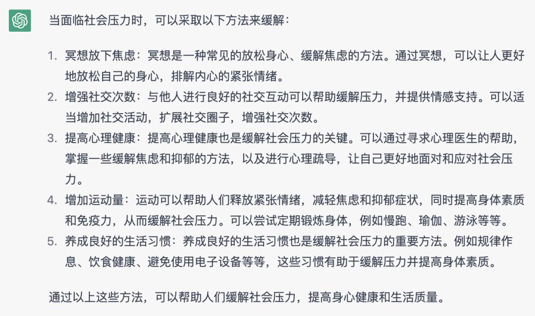 甚至视频内容也可以参考AI的回答,举个例子,如果有UP主想做“缓解社会压力能做哪些事情?”的选题,ChatGPT立刻就会给出可以冥想放下焦虑、增强社交次数、提高心理健康、增加运动量等建议。UP主可以在此基础上进行文案修改和优化,再导入剪辑应用里。
