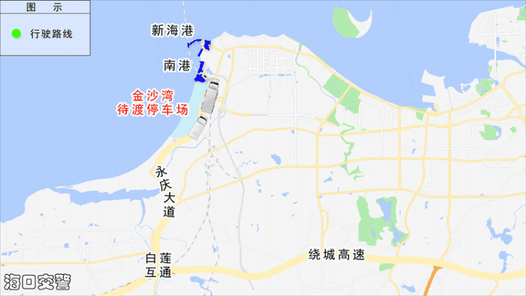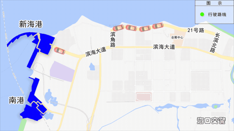 小客车前往港口路线:滨海大道→长滨北路→21号路→滨角路→滨海大道→新海港。