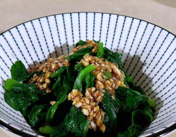 第五步:将大蒜绞碎,放入碗中。再放入少许生抽、醋、麻油进行调汁。