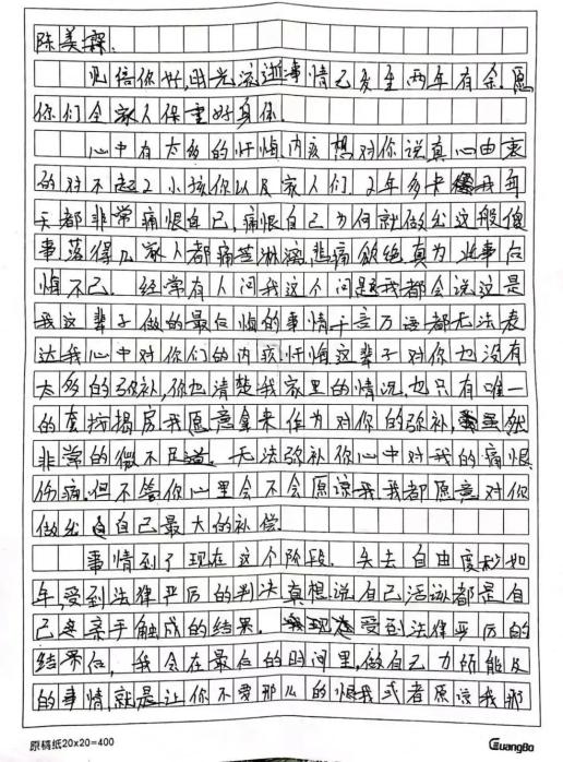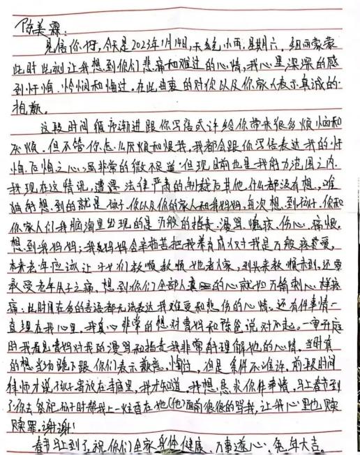 陈美霖:第二封信他是1月14号写的,我17还是18号收到的,打开看了一下,就丢在(桌子)上面。第二封信开始就没有多大的情绪波动,一个人真的忏悔,不是轻描淡写的。信里说的更多的就是后悔,谈过去,谈赔偿,谈爱,对孩子的事儿几乎没说。我知道他想干嘛,如果真的有悔改心,早干嘛去了呢?为什么要到马上二审才给我写信。