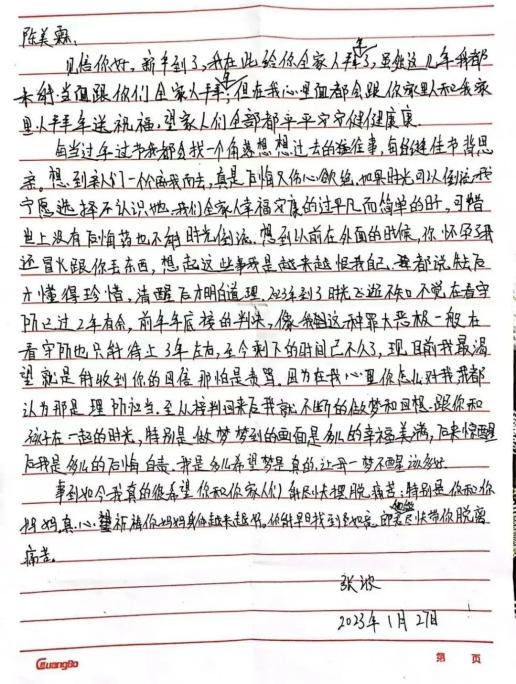 陈美霖:是,2月20号又收到一封。但字迹跟之前有点不一样,写我的姓用的是繁体字,张波根本不会写。而且还用到“咎由自取”,不像他的水平。我向张波的朋友求证过,他说一看就不是他的笔迹。