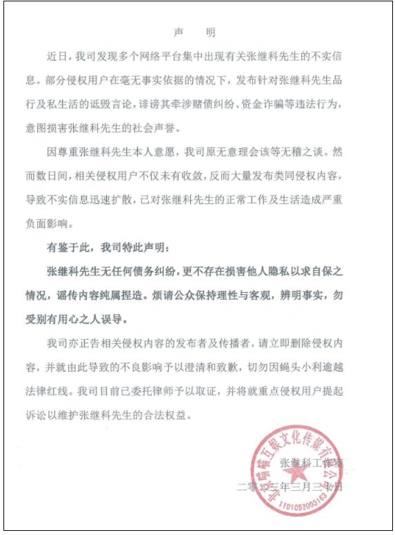 有鉴于此,我司特此声明:张继科先生无任何债务纠纷,更不存在损害他人隐私以求自保之情况,谣传内容纯属捏造。烦请公众保持理性与客观,辨明事实,勿受别有用心之人误导。