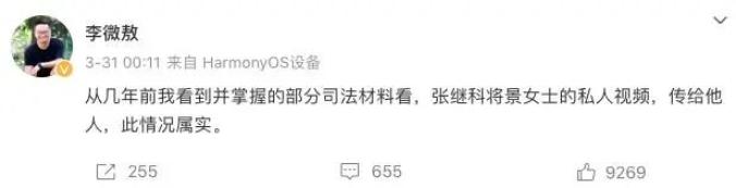 他声称,从几年前看到并掌握的部分司法材料得知,“张继科将私人视频,传给他人,此情况属实。”