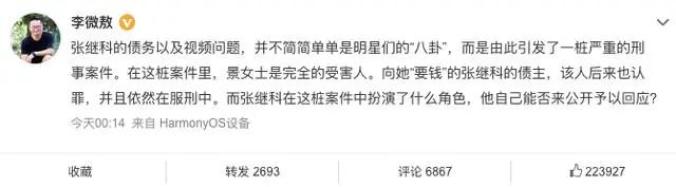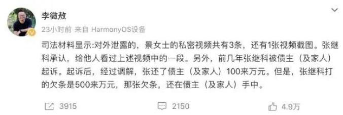 同一天,“李微敖”再次发布微博:张继科曾向他人打下500多万元的欠条,现在欠条还在债主方手中。前几年张继科曾被债主和债主的家人起诉,经过调解,张继科还了对方100多万元。