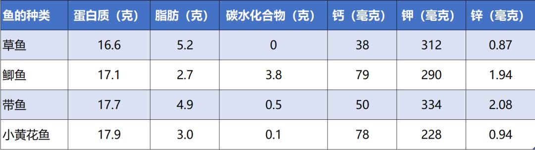 以下图片是列举了我们常吃的几种鱼的营养对比: