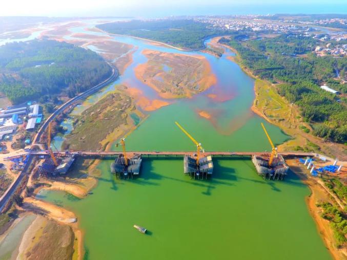 海南环岛旅游公路昌江段珠碧江大桥施工现场。2月18日,海南环岛旅游公路项目珠碧江大桥主桥70#墩左幅V腿混凝土浇筑完成;3月8日,项目文澜江大桥第一主跨顺利浇筑;3月14日,项目下浦港大桥6号墩12#块顺利浇筑完成,实现首跨合龙……施工捷报频传,极大地鼓舞了参建人员的士气,为完成“2023年6月底主线路基段基本贯通,12月特大桥段建成通车”的建设目标奠定了坚实基础。