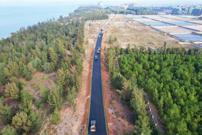 海南环岛旅游公路东方段路面沥青摊铺施工现场。同时,项目各路段正热火朝天地进行路面沥青摊铺。截至3月29日,项目累计完成投资106.06亿元,占预算总投资156.3亿元(含环新英湾支线)的67.86%;路面下面层完成397.9公里,完成比例80%;路面上面层完成277.9公里,完成比例55.9%。