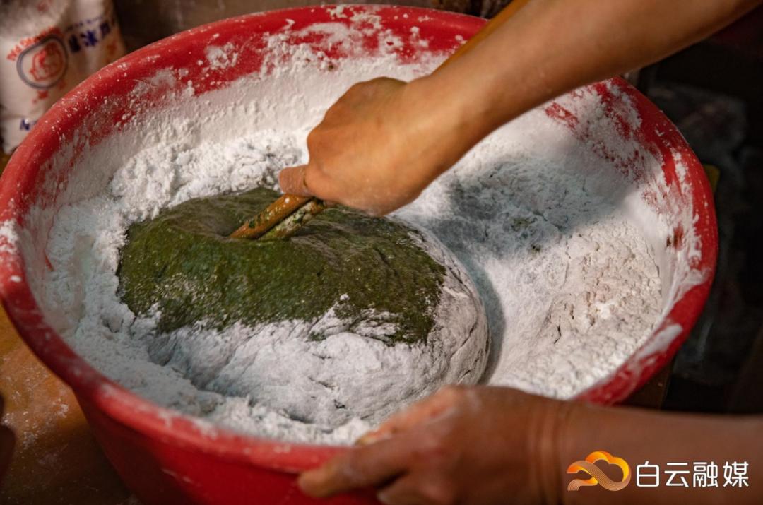 小食店老板娘:“熬制艾汁一定要用新鲜艾叶,艾草买回来要挑选摘掉老的。艾叶青涩味重,用破壁机磨汁前要先冷热相替焯水剁碎。艾汁放砂糖煮滚后,要立刻倒进糯米粉里趁热和成面团。”