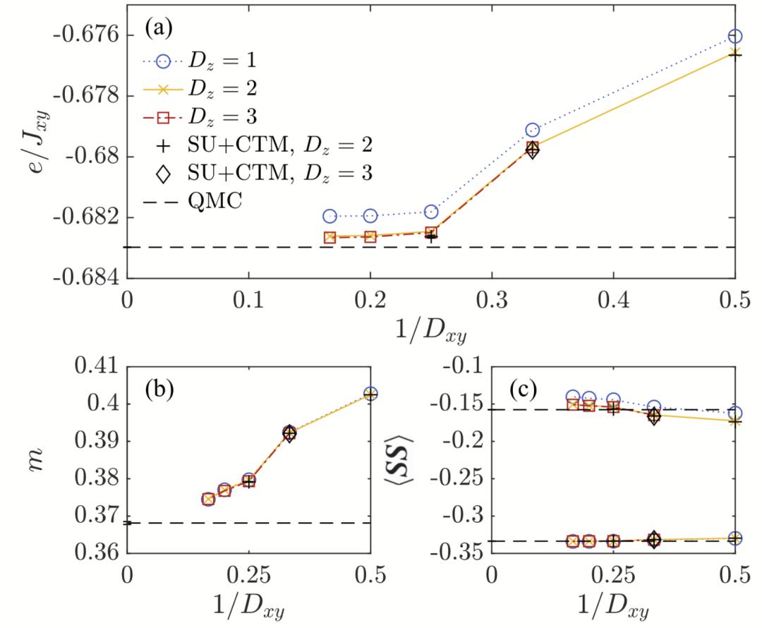 作者展示了立方晶格上各向异性三维海森堡模型的基准数据,这些数据与量子蒙特卡罗和完整三维收缩结果非常接近。最后,作者还研究了 Shastry-Sutherland 模型中带有层间耦合的二聚体的 Néel 相变(Néel phase transition)过程,这是一个由于负符号问题而难以通过量子蒙特卡罗求解的阻挫自旋模型。