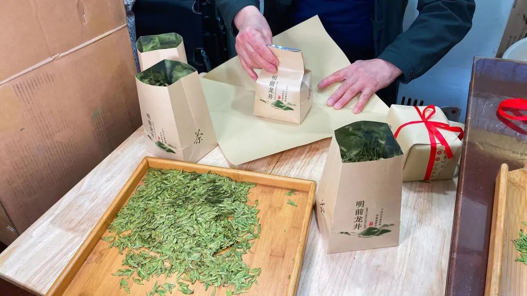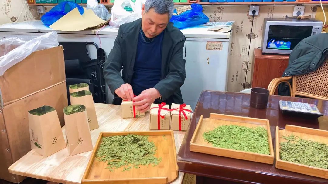 记者看到,一楼商铺内随处可见“新茶上市”的招牌,一些茶店师傅正在将新鲜到货的明前茶进行分装打包。