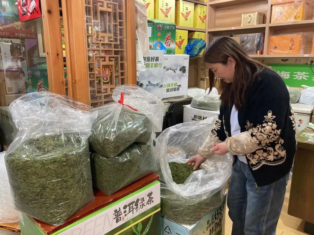 茶商程女士正在店内忙碌地理货,由于自家就是浙江安吉本地茶农,店内的主打产品——安吉白茶都是自产自销。