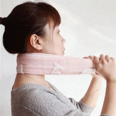 用一条毛巾折叠成条,挂到颈部,双手用力向前拉毛巾,同时脖子向后用力,停留10秒钟,放松再做,重复30次。