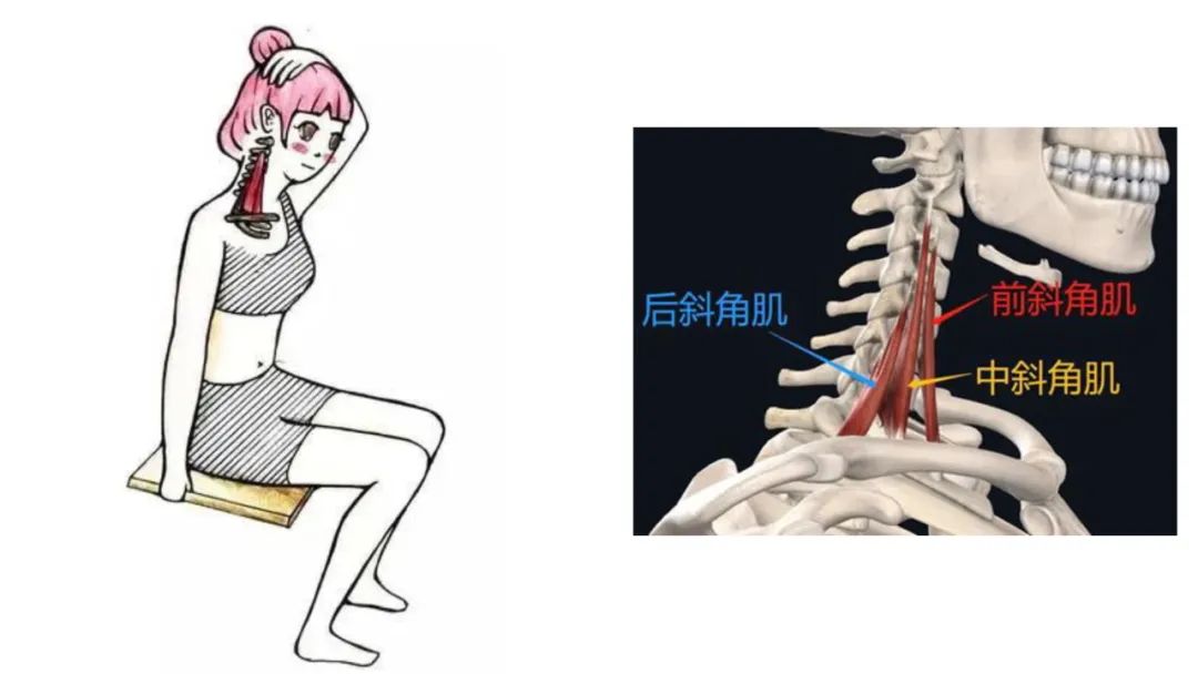 根据颈部侧屈时,头部的旋转角度不同会牵伸到不同的颈侧部肌肉。