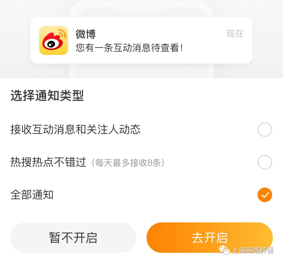 除了推荐关注内容和博主外,微博App还会时不时出现弹窗,要求用户接受通知,默认为“去开启”“推荐关注”全部默认打开