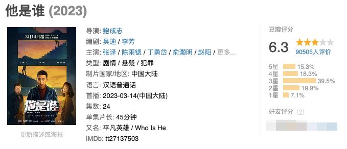 截至发稿,《他是谁》的豆瓣评分已跌至6.3分