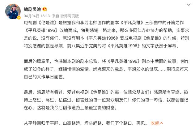 4日晚,该剧编剧吴迪发文回应烂尾,表示“电视剧《他是谁》是根据我和李芳老师创作的剧本《平凡英雄》三部曲中的开篇之作《平凡英雄1996》改编而成”,他特别感谢了导演,“前八集近乎完美的将《平凡英雄1996》的文字跃然于屏幕。”